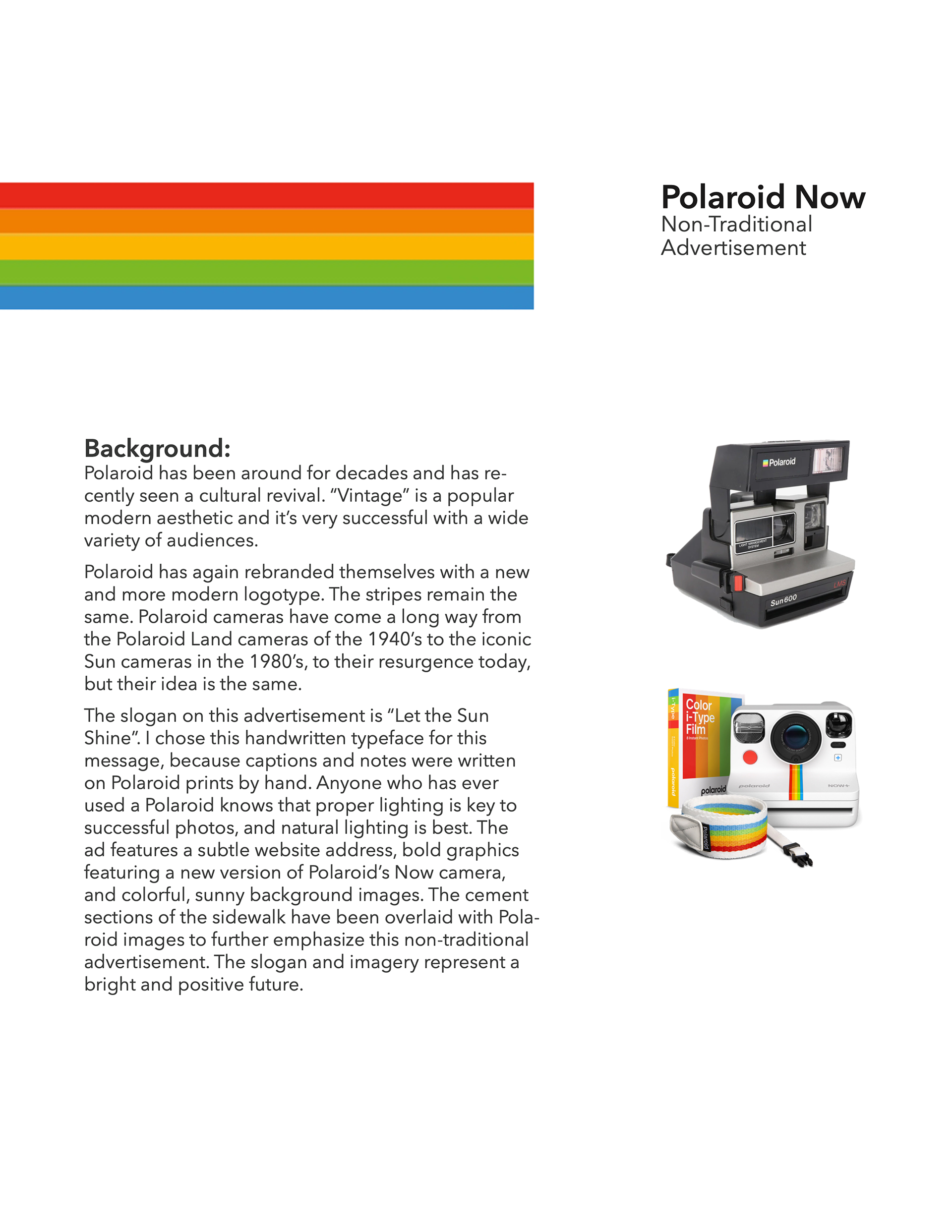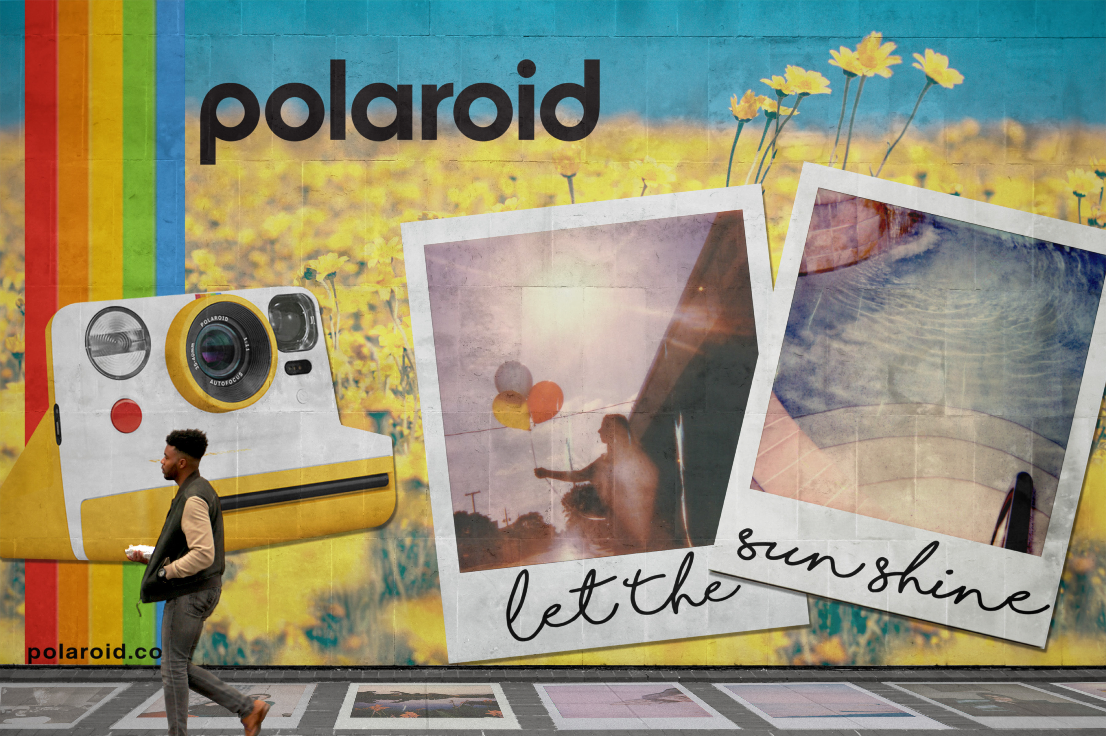 This is an advertising campaign for Polaroid. It features a wall-scale advertisement featuring Polaroid prints and sunny background images. The newest version of Polaroid's logotype is featured as well as an image of one of their newest camera models, the Polaroid Now.