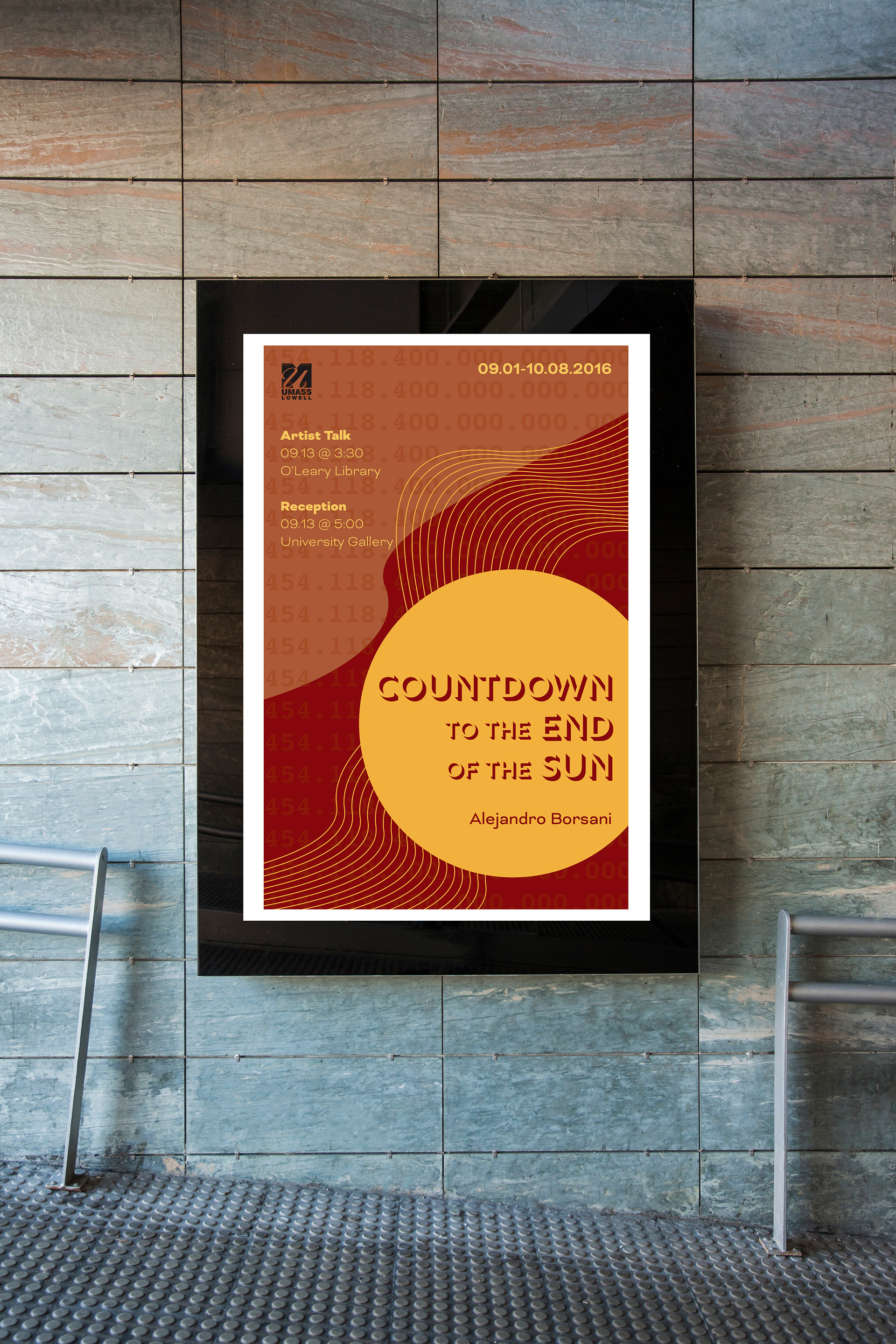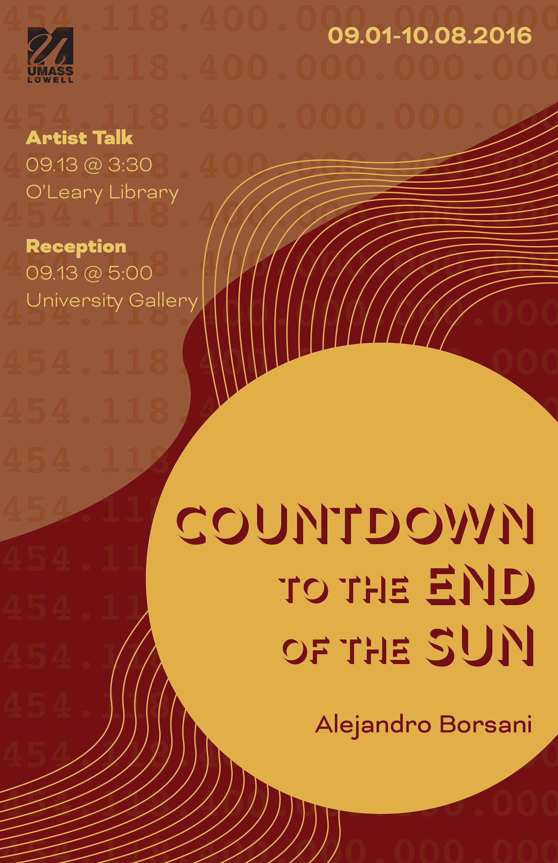 Here is a poster for an art installation entitled, "Countdown to the End of the Sun", which features exhibit information. The theme of the poster is somewhat dark and features a subtle indication of the actual number of seconds left in a countdown to the destruction of the sun.