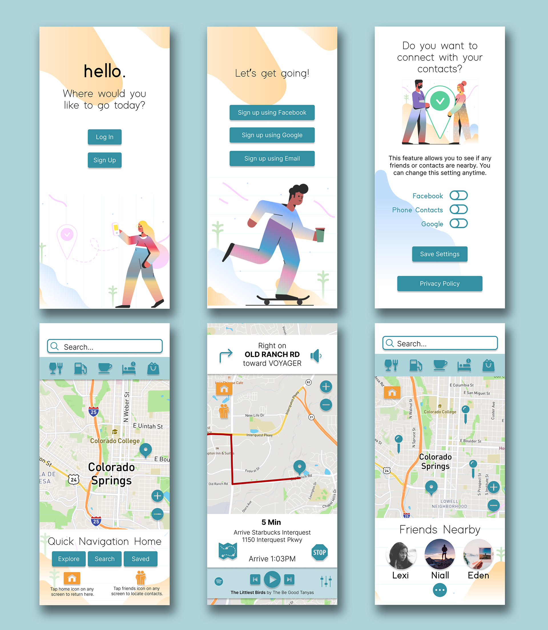 Six example screens from my map app created in Figma.